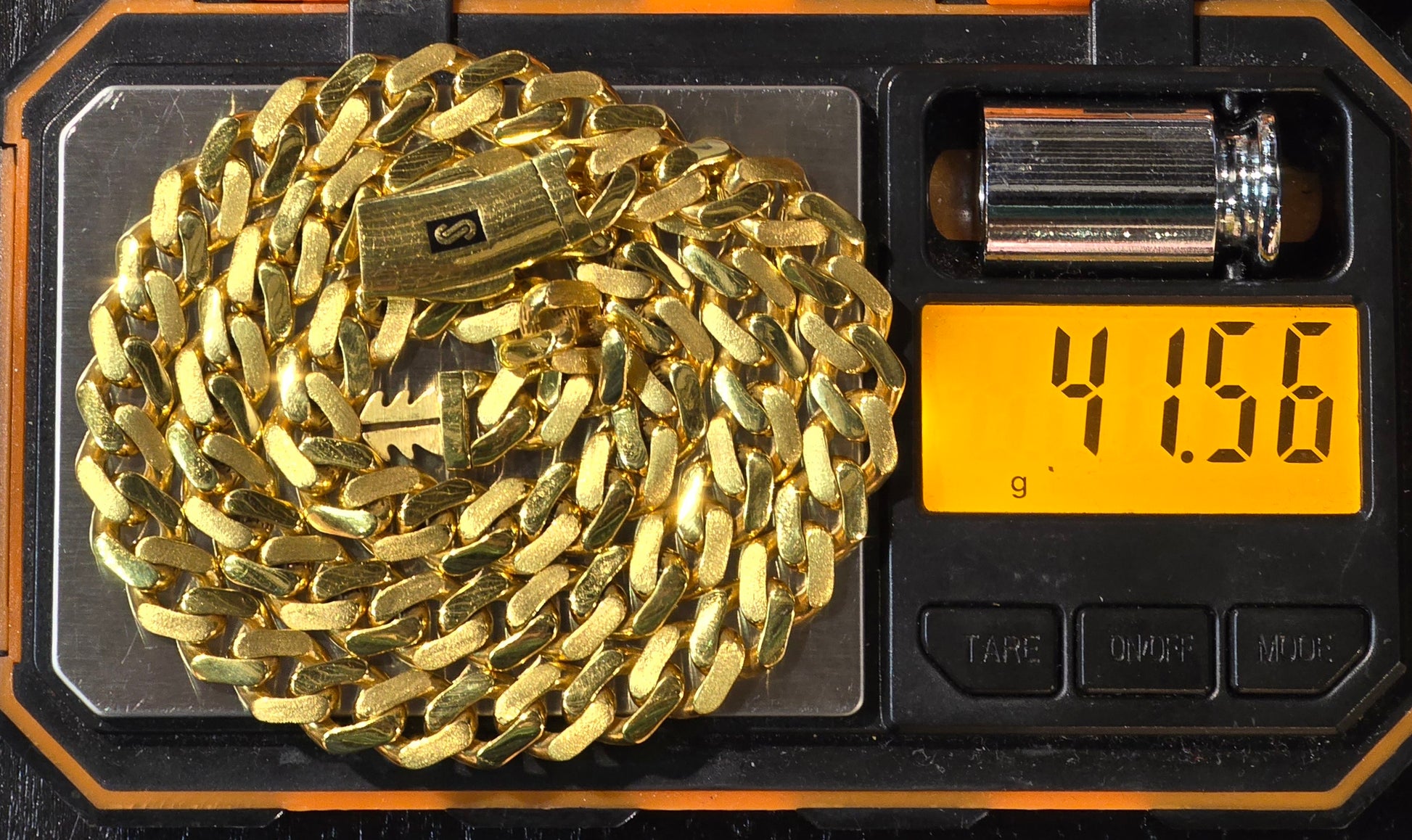Authentic Monaco chain made in real 22kt gold. Weight of the chain is 41.56 grams. Your daily chain, you can sleep in it, sweat in it or wear it while you are at the beach, this sturdy Monaco Chain is a great investment. The Chain is made out of authentic real 22kt gold and have strong locks. The style of the chain is Brush Finish Classic Cuban Miami.
